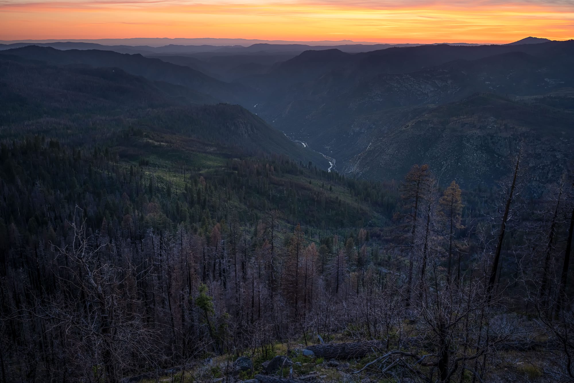 I wasn’t expecting color in the sky on my drive down from a vista point above the valley (Glacier Point). So when it happened, I was unprepared. Shot hand-held in low-light. You can see the Merced River glistening deep in the valley, surrounded by the Sierra.